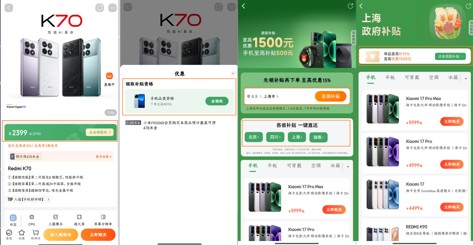 入口一:小米商城-国家补贴,修改收货地址为您所在省市,进入当地国补领取页按指引领取(部分地区需跳转云闪付领取)