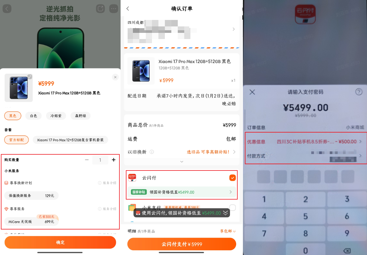 二、点击【确定】后在【确认订单】页面核实信息,注意国补订单只支持个人发票,不支持企业发票,订单完成后也无法换开;点击【云闪付支付 少数地区支持其他支付方式】→输入密码即可,输入密码页面会显示最终优惠价格。