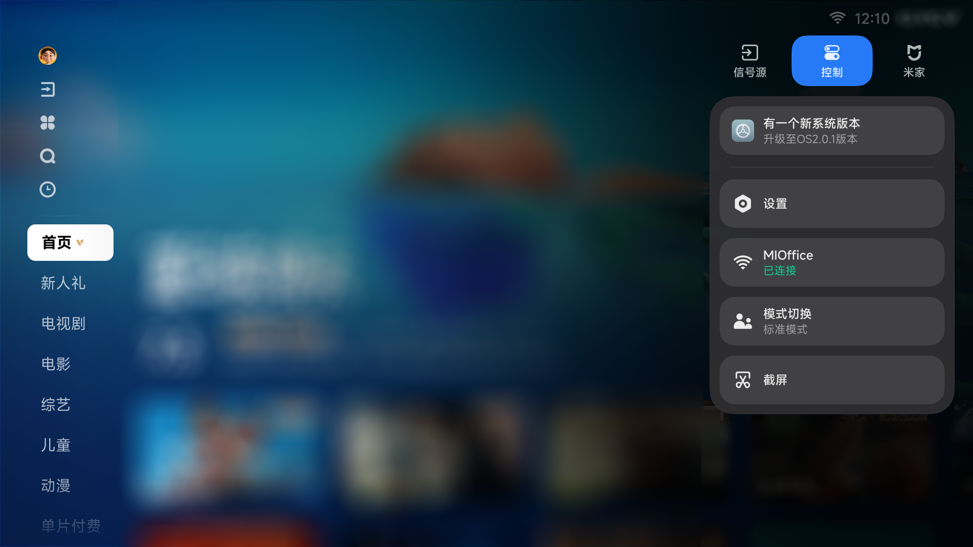 在控制中心,可以进行设置、打开常用功能、查看米家设备、进入信号源等快捷操作。