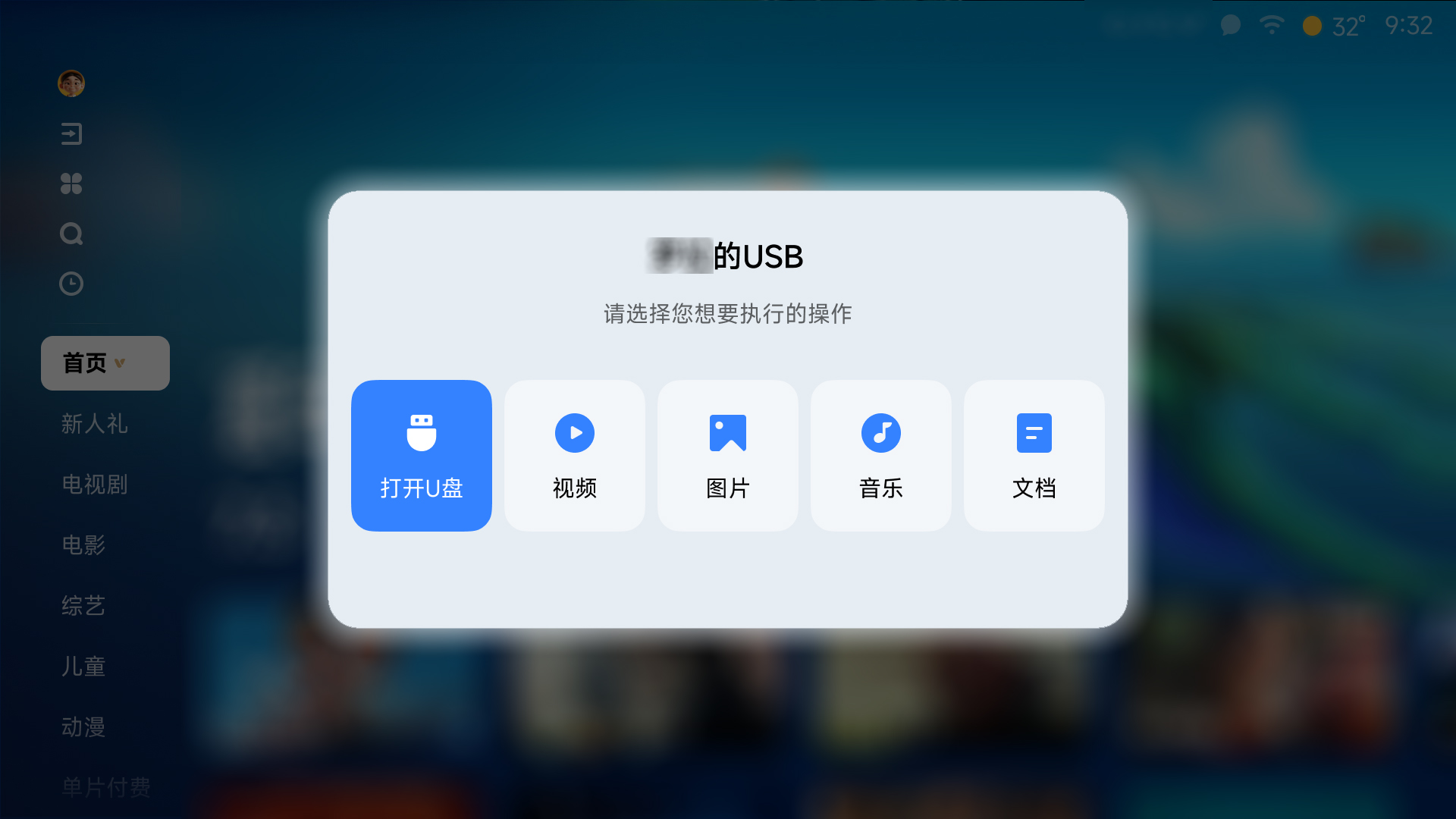 路径一:首次插入U盘后,电视将会弹出U盘弹窗,按需选择并进入对应的功能页;