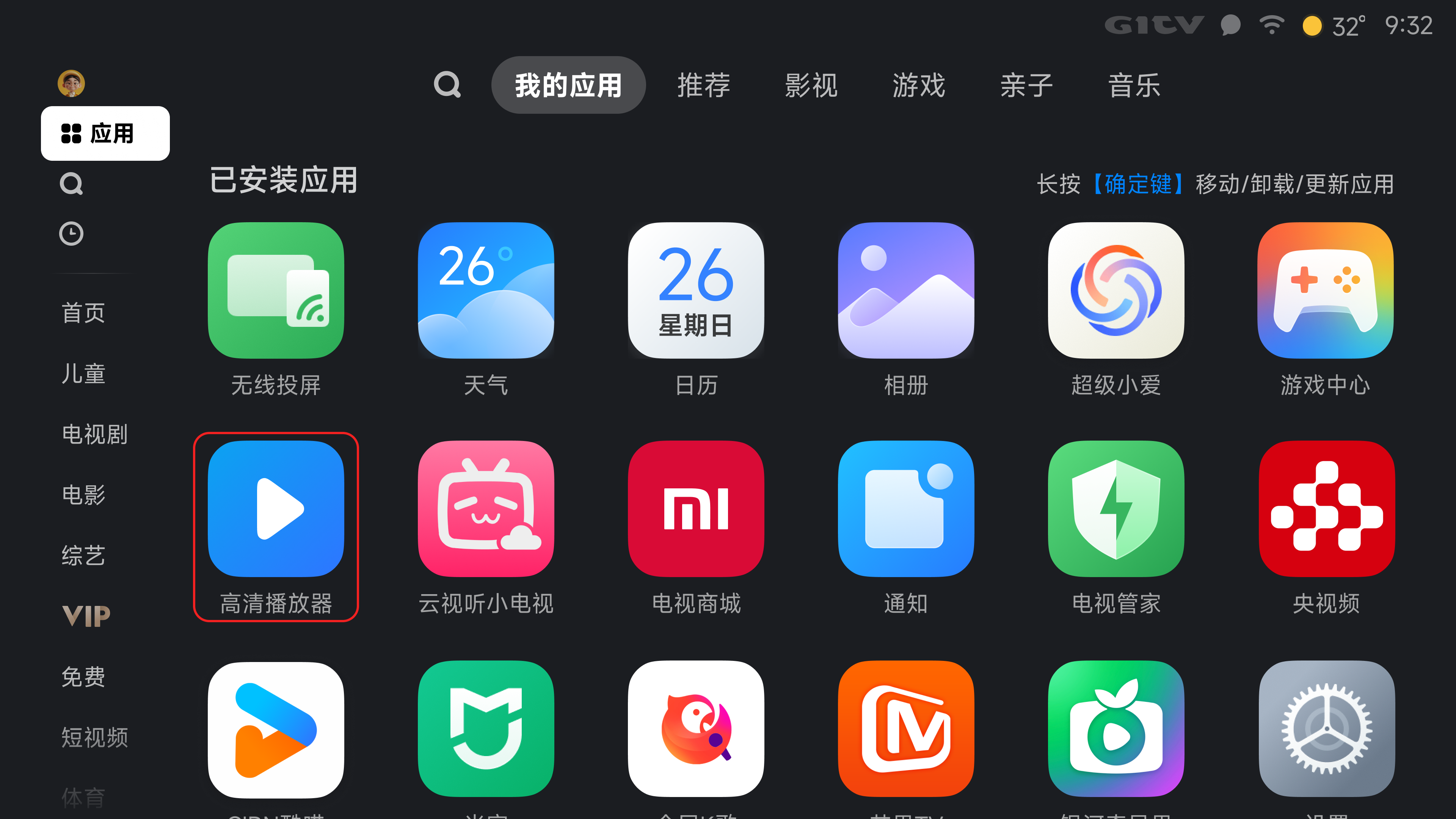 小米电视通过 “高清播放器” 访问U盘中的视频、图片、音乐文件;