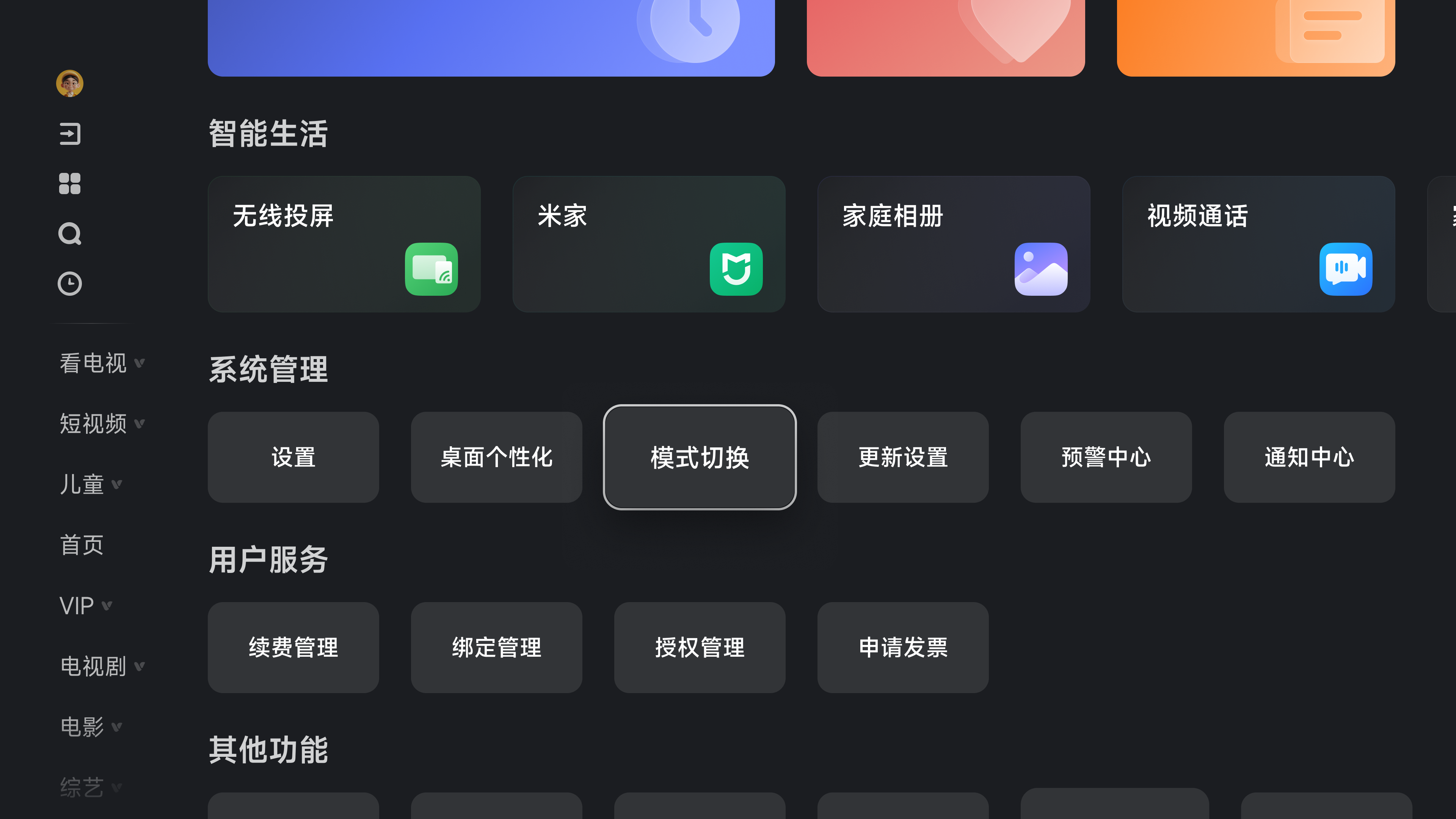 儿童模式:守护孩子安全,营造健康成长环境(可在“家长中心”进行观看时长、护眼模式、节目屏蔽等设置)