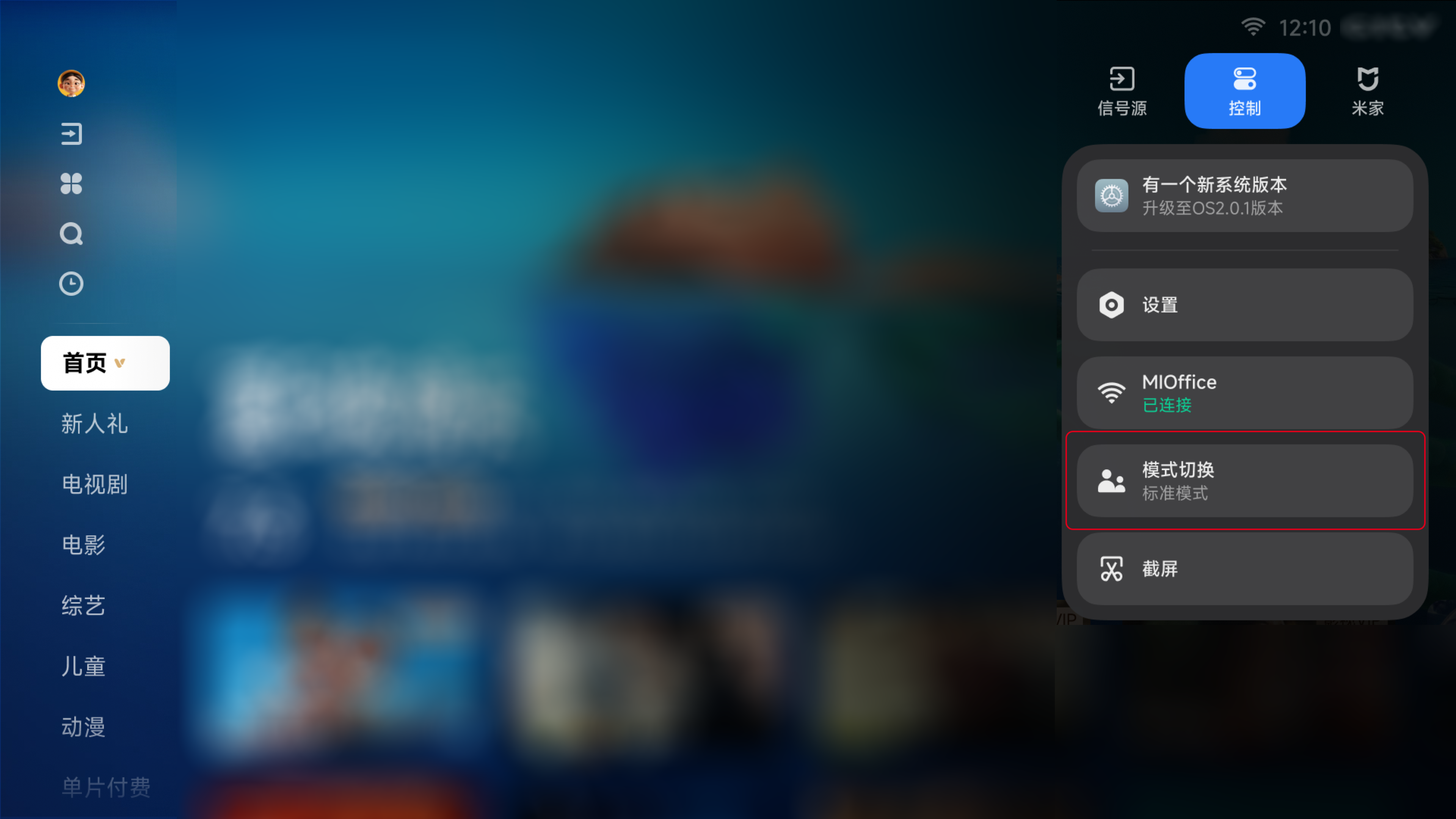 路径2:长按遥控器【菜单键】呼出控制中心,然后选择“模式切换”;